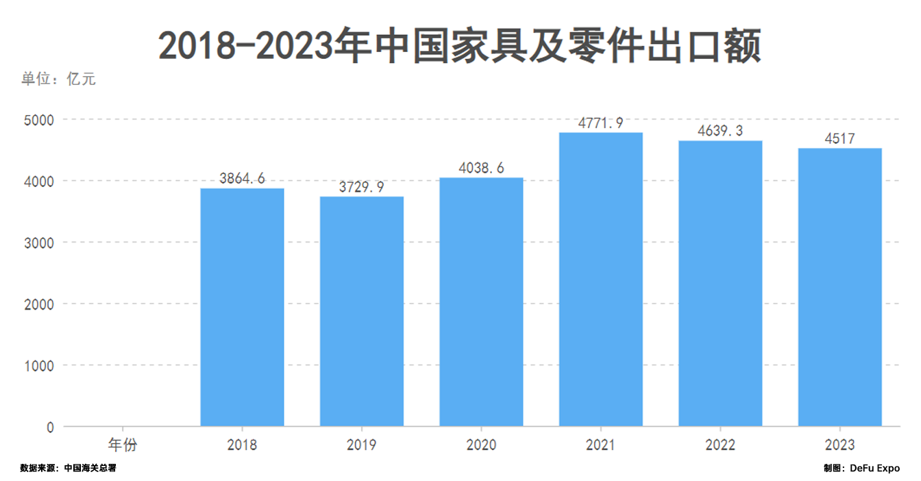 据意大利米兰家具研究所统计数据,2022年全球家具产量约为5000亿美元,中国产量占全球家具产量的37%左右。在中国海关总署出口数据中,2023年中国家具成品及零件出口额为4517亿元。由此可见,全球市场对于中国家具产品的需求量是巨大的,家具行业出海发展是大势所趋。