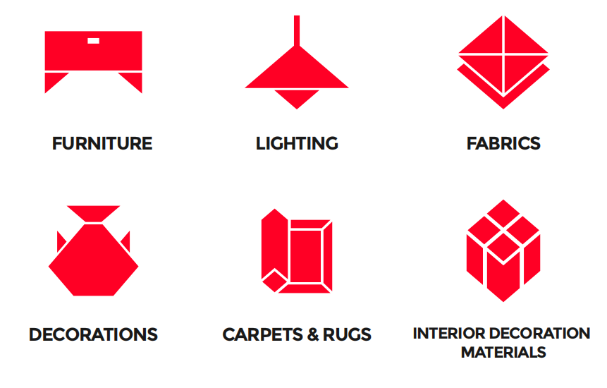 展品范围可分为6大领域,涵盖家具、灯饰、家具面料、饰品、地毯、和室内装饰材料等。