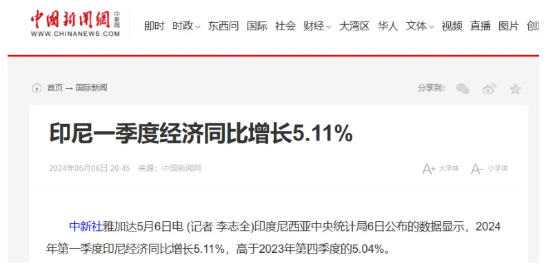 印度尼西亚经济持续保持强劲增长。根据印尼中央统计局发布的最新统计数据,印尼2024年一季度经济同比增长5.11%,超过2023年四季度的5.04%。这也是2019年以来一季度的最高增幅。