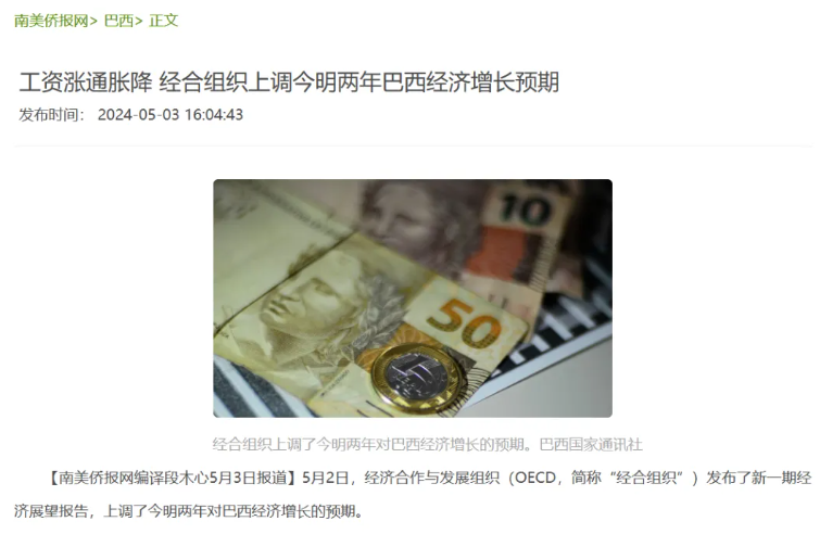 “CNN”巴西网站报道,经合组织预计,巴西2024年的国内生产总值(GDP)增速为1.9%,2025年为2.1%,皆比上次预测高出0.1个百分点。