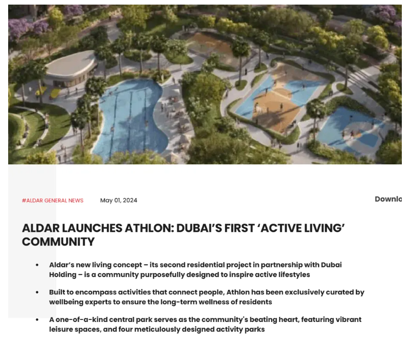 Aldar公司(Aldar Properties)宣布,旗下的开发项目Athlon仅用时2天就售罄,销售额达41亿迪拉姆(11亿美元)。该社区是Aldar与迪拜控股公司(Dubai Holding)合作在迪拜开发的第二个项目。迪拜控股公司是一家多元化的全球投资公司,在31个国家有投资。