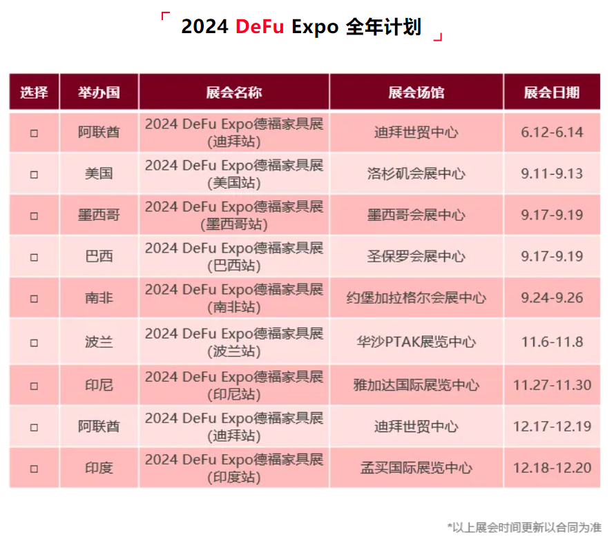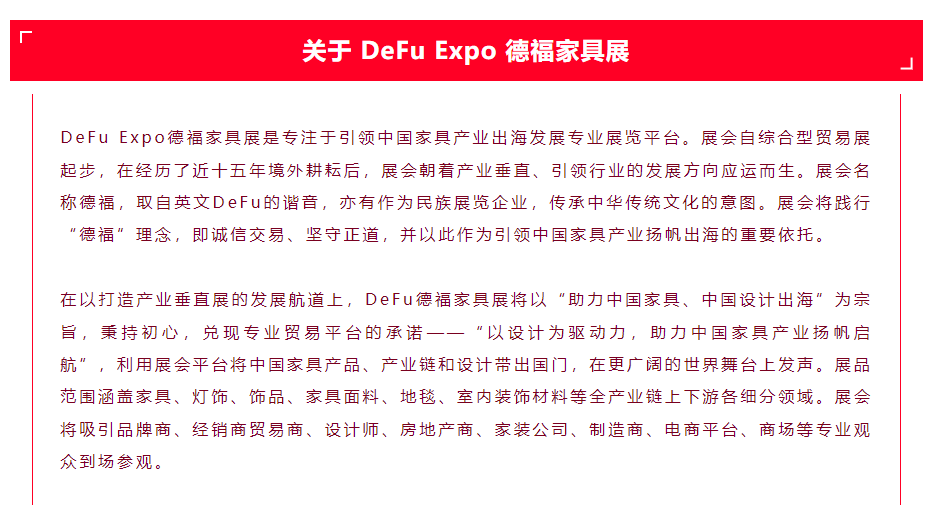 阿联酋作为“一带一路”倡议的积极参与者和经济中心,也是本年度DeFu Expo德福家具展全年系列展会的重点之一,DeFu 2024年也将发挥迪拜作为国际商业和贸易枢纽的独特优势,为中国家具产业提供一个展示创新设计和制造实力的国际平台。促进中国家具制造商与中东市场之间的交流与合作。