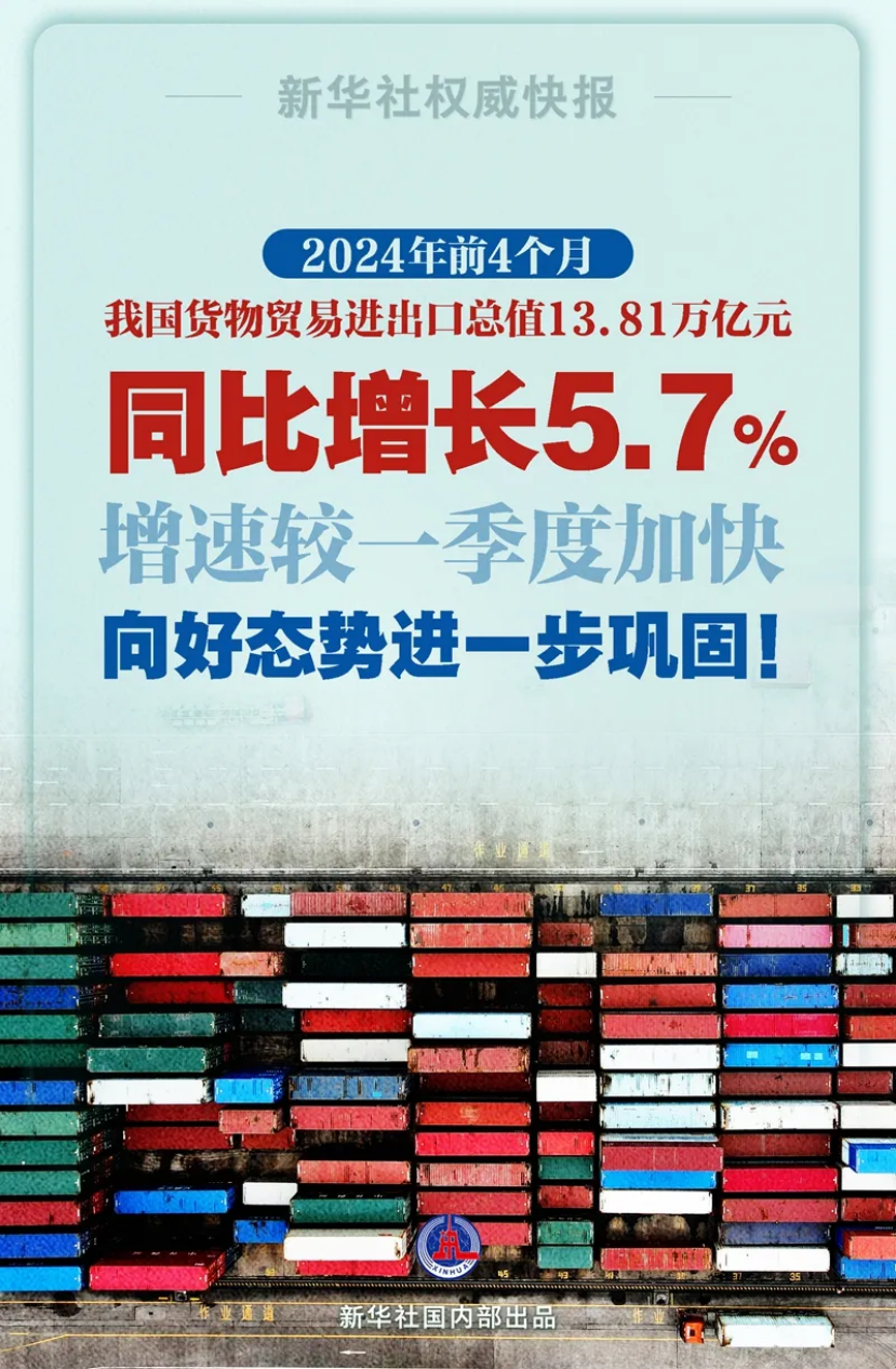 5月9日,海关总署发布数据显示,前4个月,我国货物贸易进出口总值13.81万亿元,同比增长5.7%。其中,出口7.81万亿元,增长4.9%;进口6万亿元,增长6.8%。对于外贸表现,海关总署统计分析司司长吕大良表示,今年以来,我国外贸领域的积极因素不断增多,动能持续增强。前4个月进出口增速较一季度加快,规模创历史同期新高,我国外贸向好态势进一步巩固。