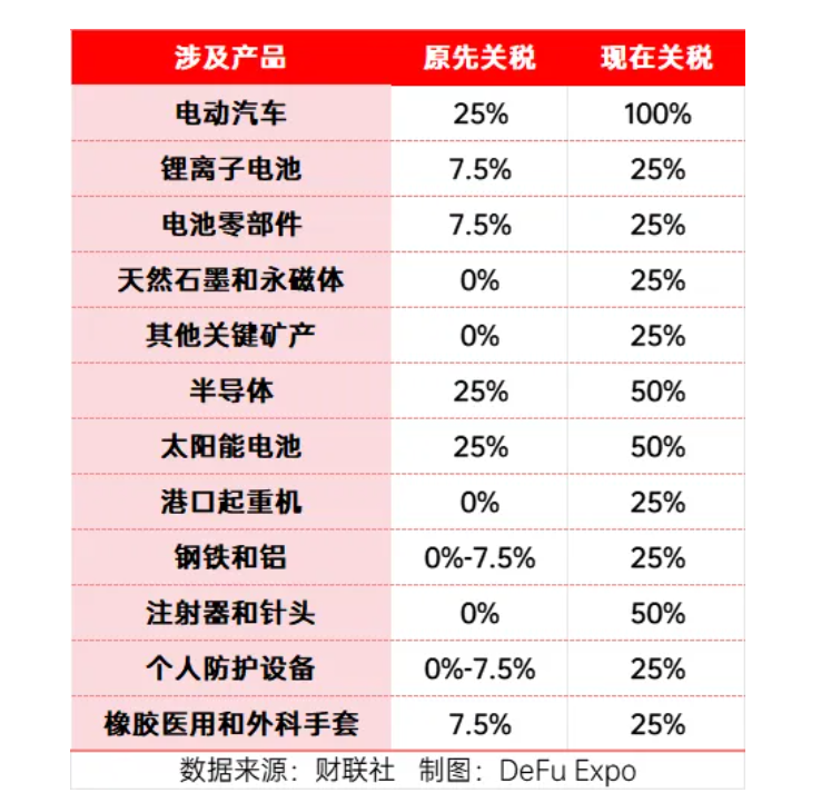 2024年5月14日,美方发布对华加征301关税四年期复审结果,宣布在原有对华301关税基础上,进一步提高对自华进口的电动汽车、锂电池、光伏电池、关键矿产、半导体以及钢铝、港口起重机、个人防护装备等产品的加征关税。