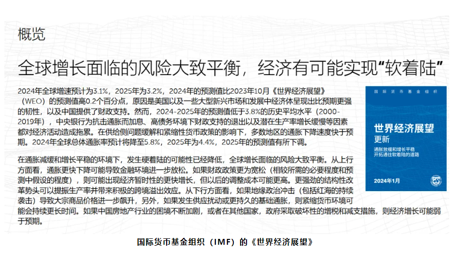 根据国际货币基金组织(IMF)的《世界经济展望》更新报告,2024年全球经济增速预计为3.1%,2025年为3.2%。美国以及一些大型新兴市场和发展中经济体展现出的韧性,以及中国的财政支持,是全球经济预测上调的原因之一。