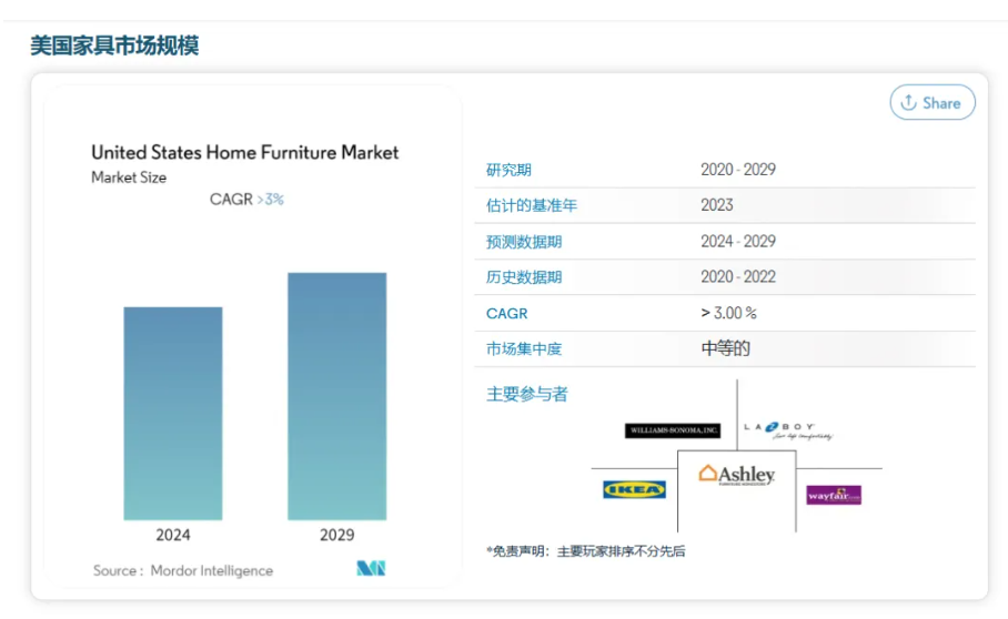根据Mordor Intelligence数据统计,今年美国家居市场估计为 348 亿美元,2024年-2029年的复合年增长率将超过3%。市场的主要驱动力之一是研究期间不断增长的住宅建筑市场。可组装 (RTA) 家具因其较低的成本和紧凑的设计而越来越受到房主和租户的欢迎。 RTA家具,也称为平板包装家具,不是由制造商组装的,而是以零件形式提供,并附有如何组装的说明。电子商务也在推动市场的增长,有许多电子商务巨头,例如例如 Amazon、Wayfair 和 Home Depot,它们提供来自许多主要品牌的各种家具产品,作为其产品组合的一部分。