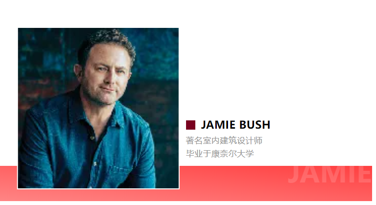 Jamie Bush是Jamie Bush + Co.的CEO及创始人,是享誉全球的室内建筑设计师,专注于中世纪现代住宅设计。Bush以融合建筑与室内设计的整体性方法而知名,其作品在全球众多顶尖出版物中发表。他是AD100年度全球顶级建筑师和设计师之一,也是Elle Decor顶级设计师A-List成员。