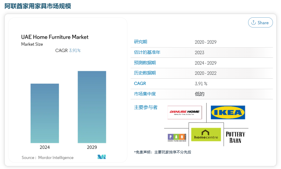 根据Mordor Intelligence研究数据表明,阿联酋家居市场今年的收入为 19 亿美元,预计在预测期内复合年增长率将超过 3.91%。阿联酋家居家具市场规模估计到 2024 年为 25.9 亿美元,预计到 2029 年将达到 31.2 亿美元,在预测期间(2024-2029 年)的复合年增长率为 3.79%。