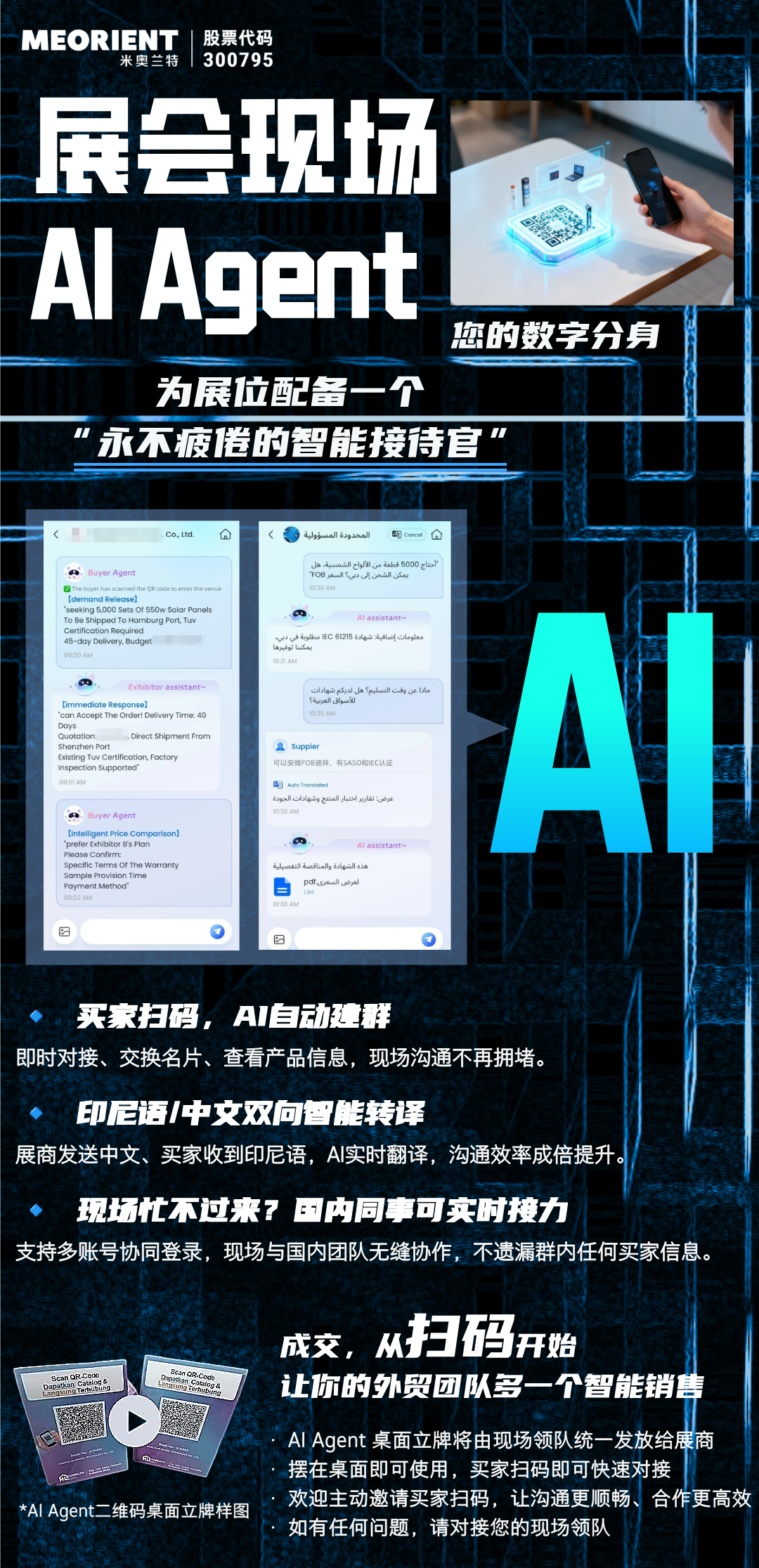 在本届印尼展现场,随处可见展位上放置的展会现场AI Agent立牌,这是米奥兰特AI慧展的一大核心服务,为展商配备了一个“永不疲倦的智能接待官”,助力展商高效对接印尼买家