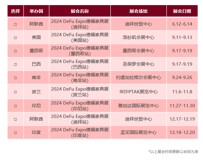 DeFu Expo德福家具展是专注于引领中国家具产业出海发展专业展览平台。展会自综合型贸易展起步,在经历了近十五年境外耕耘后,展会朝着产业垂直、引领行业的发展方向应运而生。展会名称德福,取自英文DeFu的谐音,亦有作为民族展览企业,传承中华传统文化的意图。展会将践行“德福”理念,即诚信交易、坚守正道,并以此作为引领中国家具产业扬帆出海的重要依托。