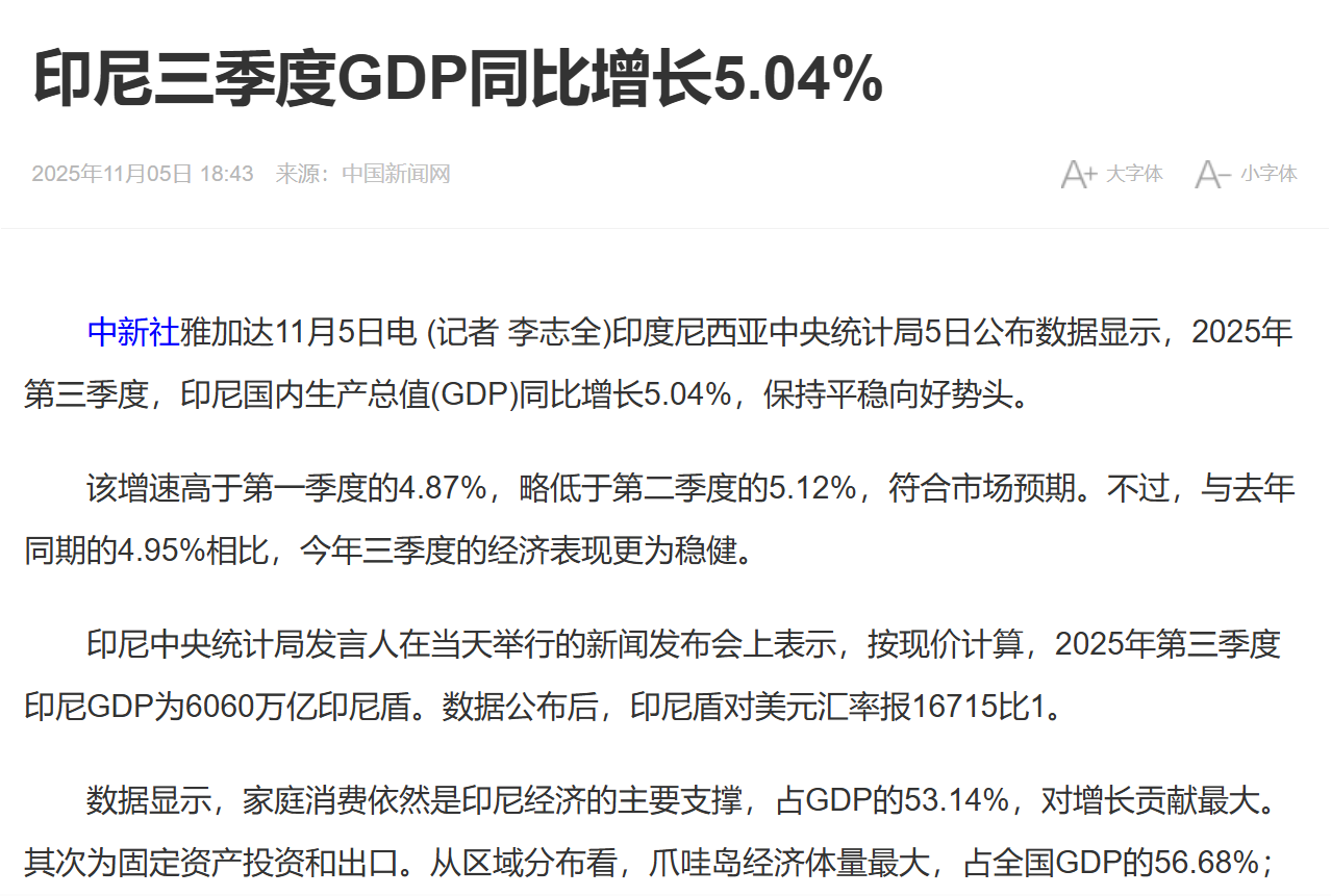 2025年一季度印尼GDP同比增长4.87%(BPS)。