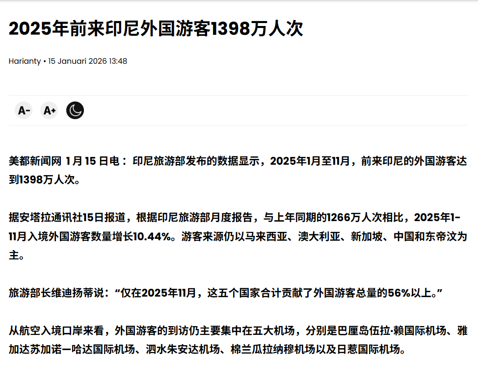 BPS在2026年1月发布的统计显示:2025年11月国际游客到访约120万人次、2025年1—11月累计约1398万人次;同时披露了相关住宿指标(酒店入住/客房指标等)。这类数据对酒店、服务公寓、商业空间的软装更新具有直接参考价值。